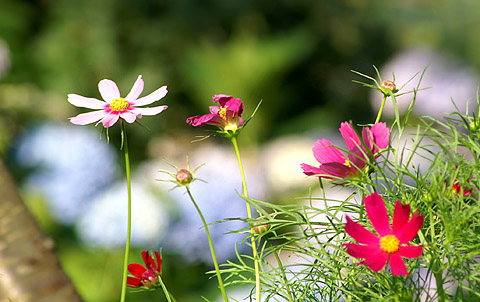 コスモスは今年も咲き始めた ピンク色や赤色が鮮やかに 庭の片隅で映えわたっている コスモスの季節は ちょっと早く到来した〜 庭に咲いたコスモスの花: コスモスの花言葉は「乙女の心情」(撮影:2007/07/10)